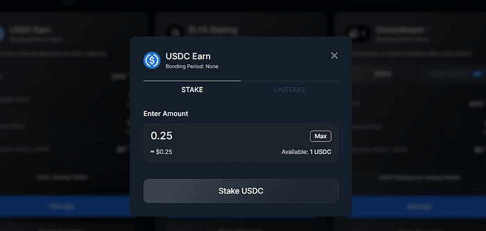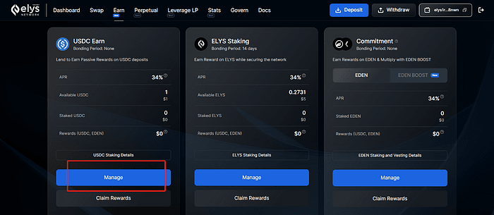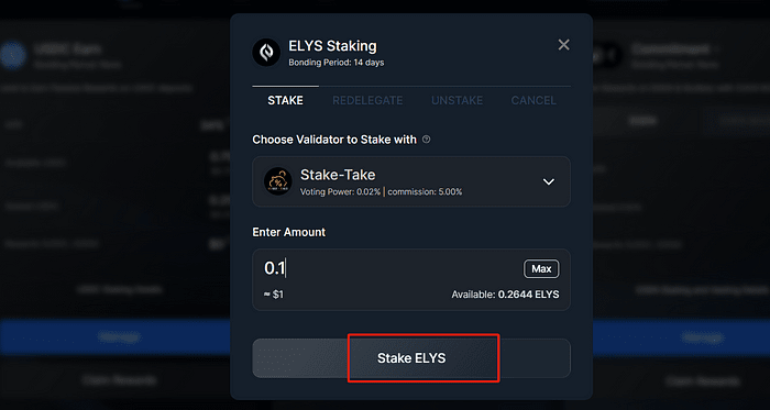 ➢ Choisissez le pool USDC et cliquez sur « Gérer ». ➢ Stake USDC en saisissant le montant souhaité et en confirmant la transaction. ➢ Répétez la démarche pour la cagnotte ELYS en sélectionnant un validateur, en saisissant le montant et en confirmant la transaction.