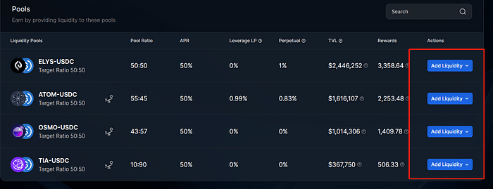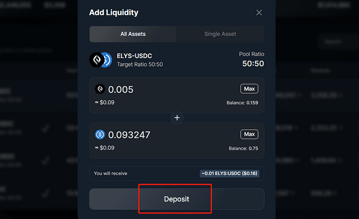 ➢ Choisissez n'importe quel pool et cliquez sur « Ajouter des liquidités », comme le pool ELYS-USDC. ➢ Déposez le montant souhaité et confirmez la transaction.