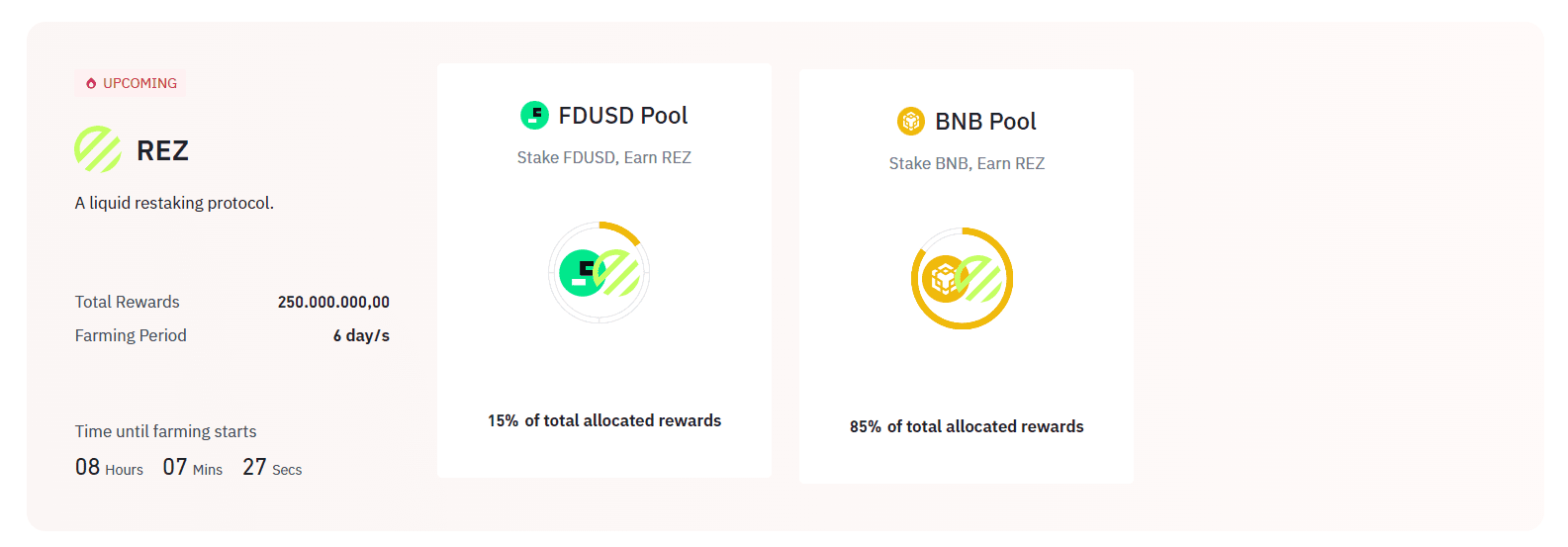 85 % de ces récompenses seront distribuées aux stakers de BNB, tandis que le pool de jalonnement FDUSD recevra 15 %. Cependant, cela ne signifie pas nécessairement que vous gagnerez plus de REZ si vous stakez du BNB plutôt que du stablecoin. Tout dépend de l'importance de votre mise par rapport à la taille de l'ensemble du pool de jalonnement.