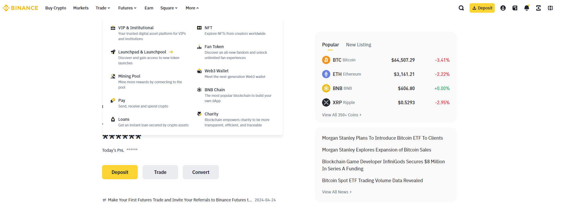 1. Connectez-vous à votre compte Binance et cliquez sur le bouton de navigation - [Plus].