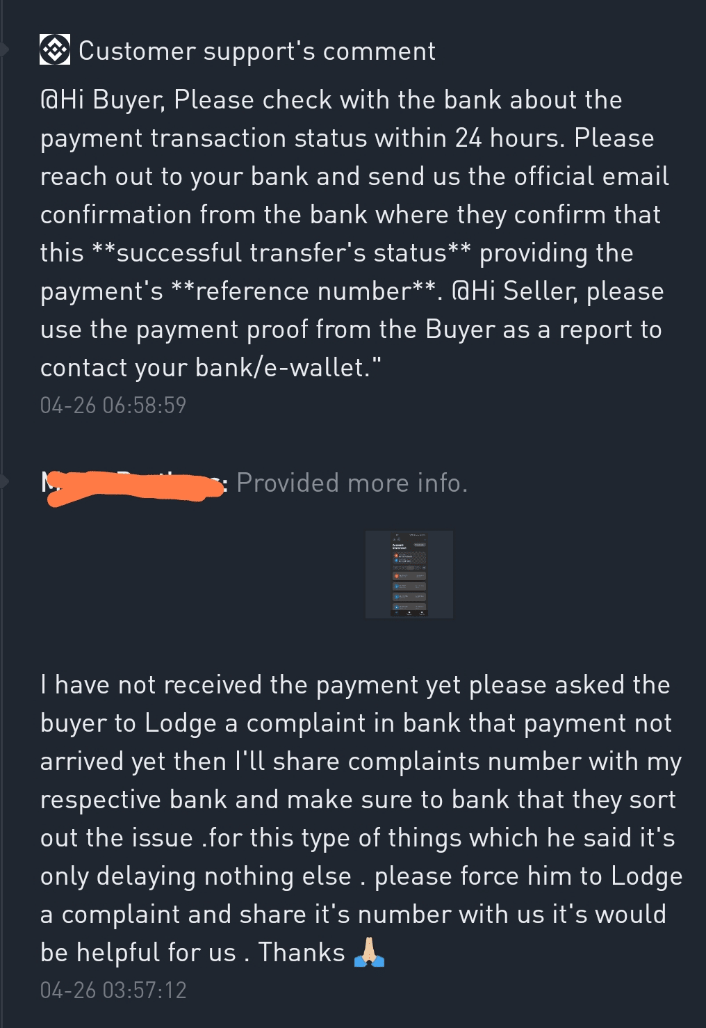 Il est assez évident de détecter une fraude de la part du vendeur, mais le service client a conclu que la transaction n'a pas encore été reçue sur le compte du vendeur. (Ce vendeur présente également de fausses informations d'identification à Binance et change très souvent de compte. L'un de ses comptes fait l'objet d'une enquête de la branche cybercriminalité de la FIA Pakistan. Je l'ai également signalé à la FIA, mais de tels cas prennent beaucoup de temps au Pakistan en raison des pots-de-vin importants versés par ces gangs frauduleux.)