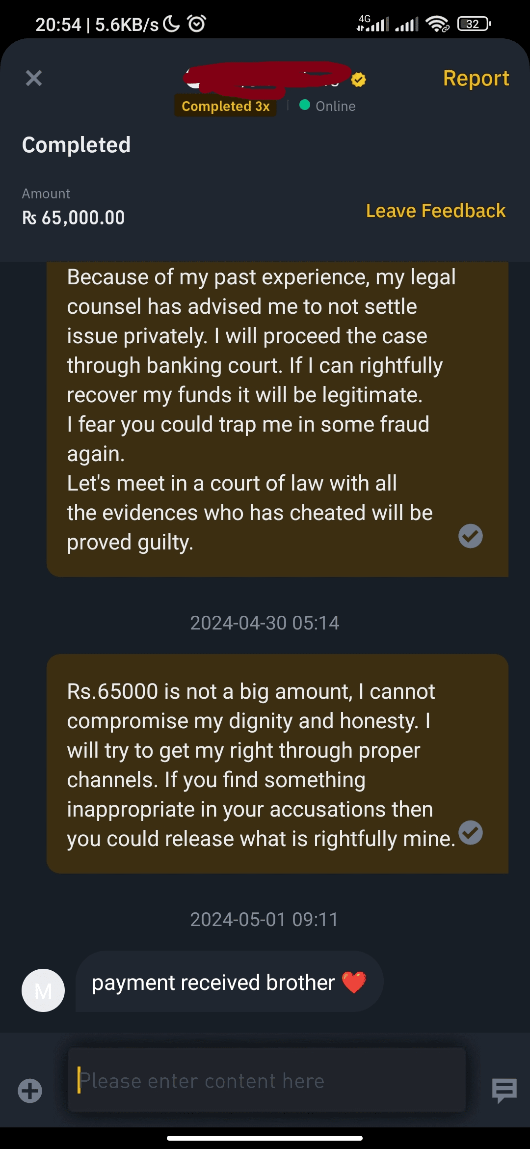 J'étais alarmé et je n'ai pas accédé à sa demande. Au lieu de cela, j'ai déposé un recours pour obtenir la restitution de près de 65 000 PKR en USDt. Parce que je le soupçonnais de mentir et d'inventer des histoires.