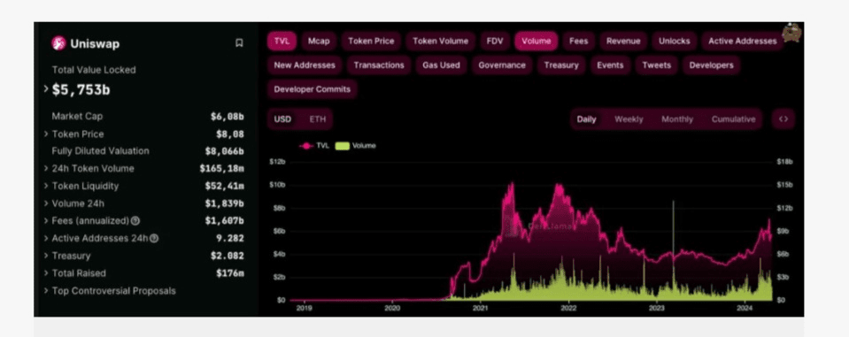 Compte tenu de l’afflux attendu de capitaux dans l’écosystème Ethereum, Aave pourrait devenir le moyen privilégié pour les investisseurs de recevoir des revenus des jetons ERC-20 via des prêts ou une participation aux marges du commerce du lin via des emprunts. Uniswap (UNI) pour le trading Uniswap (UNI) est la première bourse de teneur de marché automatisée décentralisée (AMM), qui reste la plus populaire. Uniswap est leader en termes de volume d'échange dans la finance décentralisée, et ses pools de swap sont les plus liquides pour échanger des jetons Ethereum. Le protocole se classe actuellement au cinquième rang en termes de TVL dans l’écosystème Ethereum, deux positions derrière Aave. Cependant, la gestion des tokens UNI a une capitalisation boursière de 6,08 milliards de dollars et un taux de 1,05 MCap/TVL. L'indicateur indique qu'UNI se négocie actuellement à un prix équitable basé sur le nombre total de jetons investis dans son écosystème. Cette situation suggère que le prix d’Uniswap pourrait suivre proportionnellement l’augmentation future du TVL, qui est susceptible de se produire en raison de l’afflux de capitaux dans les jetons basés sur Ethereum.
