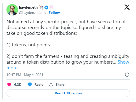 Hayden Adams, PDG d'Uniswap, a récemment discuté de l'éthique de la distribution de jetons. Cette discussion a eu lieu après l'émergence de préoccupations concernant l'équité de la distribution des jetons sur EigenLayer.