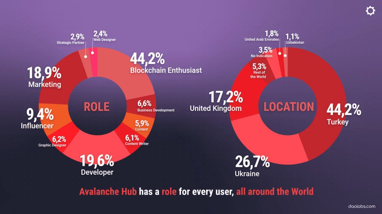 La répartition des membres de la communauté d'Avalanche Hub par pays, compétences en matière de blockchain et compétences professionnelles est également remarquable.