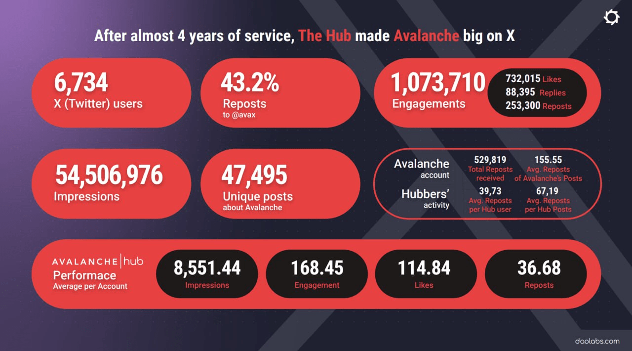 Les chiffres générés par Avalanche HUB sur X sont également très frappants. 6 734 utilisateurs membres d'Avalanche HUB avec plus d'un million d'engagements ont généré plus de 54,5 millions d'impressions.