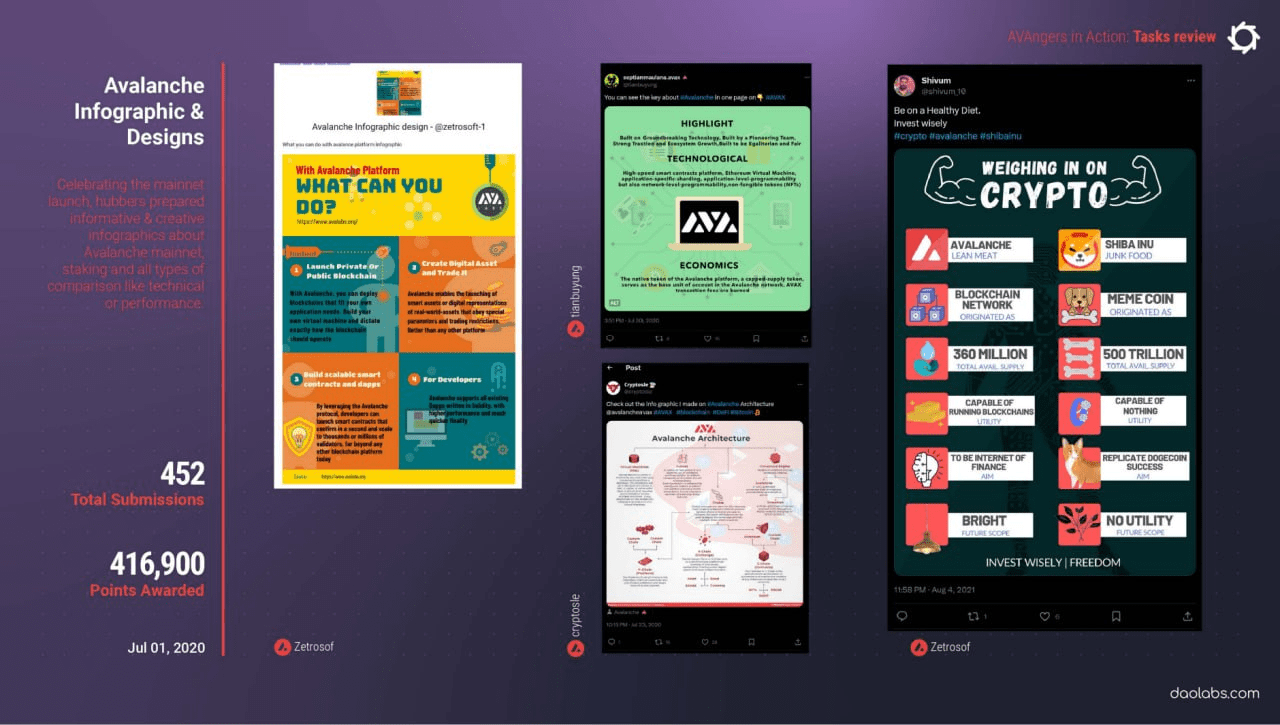 L'infographie ci-dessus présente l'un des aspects les plus influents de l'Avalanche HUB. Lors du test du réseau Avalanche en 2020, les mineurs sociaux ont testé leurs connaissances techniques et leurs compétences en tant que validateurs.