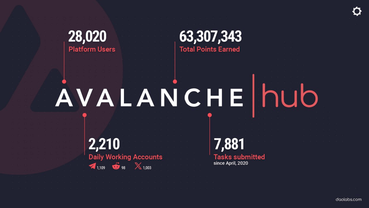 Si l'on regarde les valeurs produites par Avalanche HUB, qui ne cesse de croître depuis plus de quatre ans, en avril 2024, 28 000 membres enregistrés du HUB ont accompli à ce jour près de 8 000 tâches d'équipe. Avalanche HUB continue de diffuser l'écosystème Avalanche avec 2 200 mineurs sociaux actifs quotidiennement sur Telegram, Twitter et Reddit.
