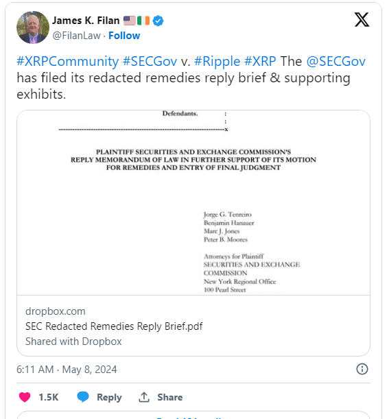 Mardi, la SEC des États-Unis a déposé sous scellés son mémoire en réponse aux mesures correctives et ses pièces justificatives. De plus, Ripple a déposé ses recours expurgés, son mémoire en réponse et ses pièces justificatives lors de l'accès au jugement final.