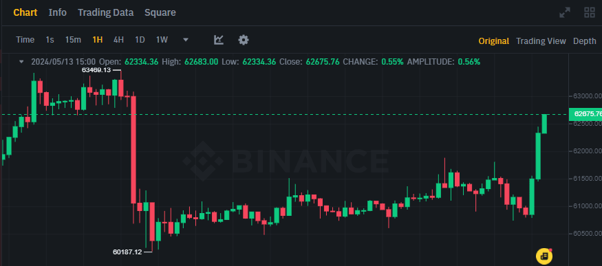 Dans l'après-midi du 13 mai, le prix du Bitcoin ($BTC ) a grimpé de manière inattendue, passant de 60 800 $ à 62 700 $ en seulement 3 heures.