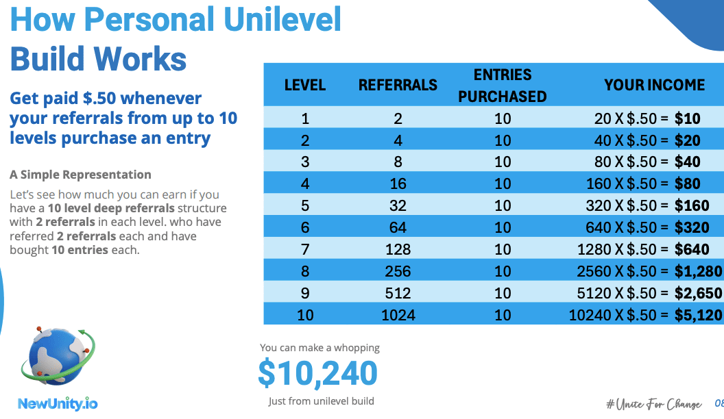 Ils prétendent que vous pouvez gagner plus de 10 000 $ uniquement avec la version unilevel, car chaque niveau dispose d'options de parrainage illimitées.