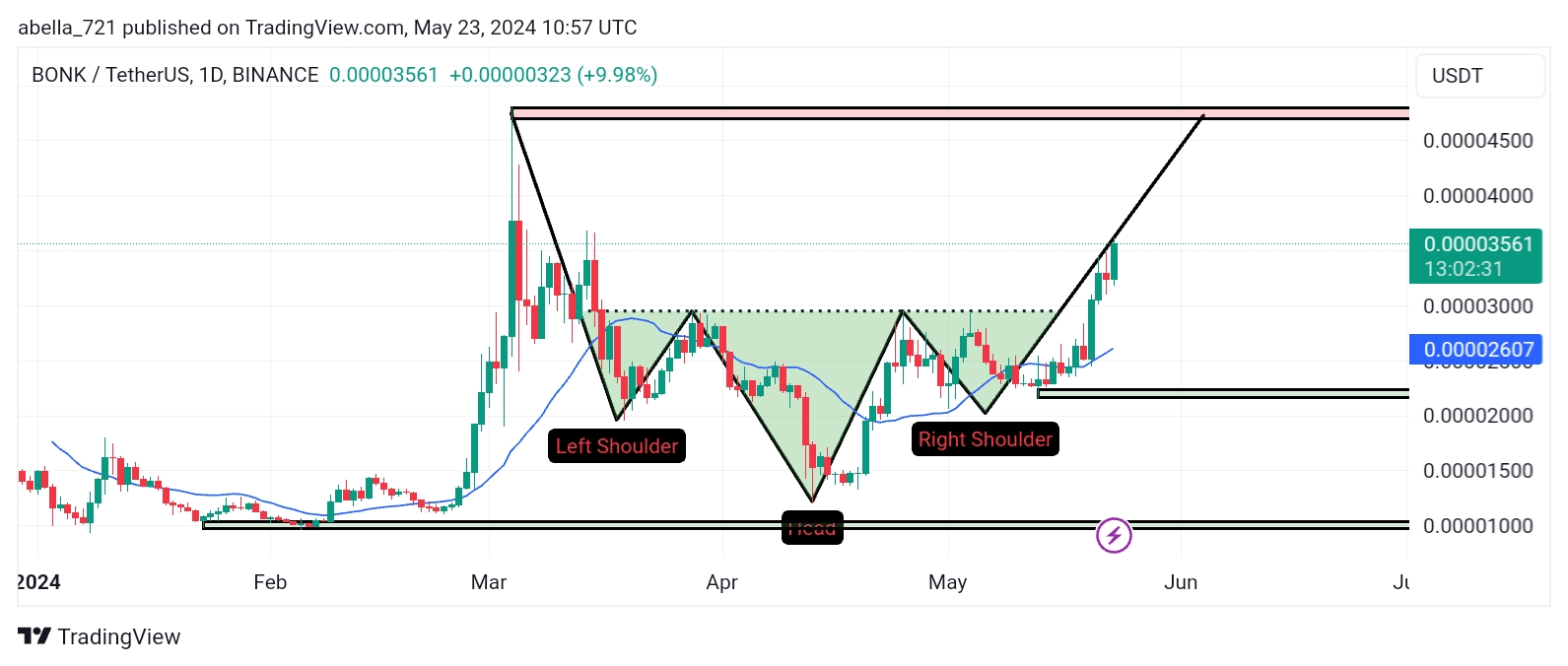 Sur la base de l'analyse technique de la paire $BONK , il existe des signes prometteurs d'une potentielle dynamique haussière. La formation de la configuration « tête et épaules » indique un changement dans le sentiment du marché, favorisant un potentiel mouvement haussier. Les traders doivent surveiller de près les niveaux de prix mentionnés pour évaluer la direction du marché et planifier leurs stratégies de trading en conséquence.