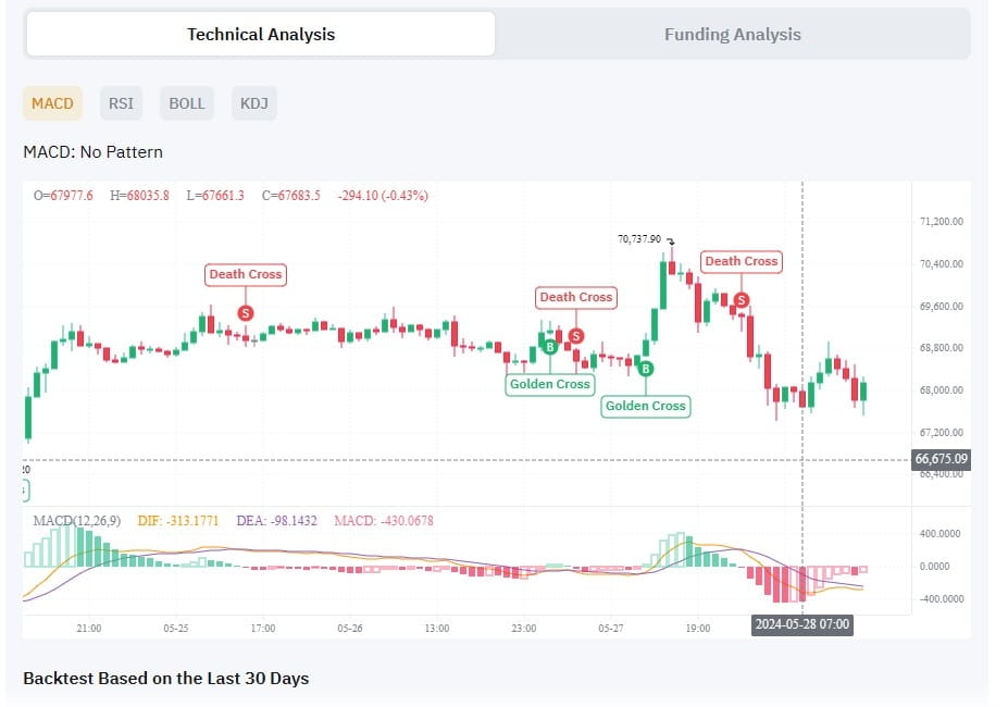 5. Les derniers niveaux de support et de résistance du BOLL sont respectivement de 67 461,2 $ et 69 280,6 $.