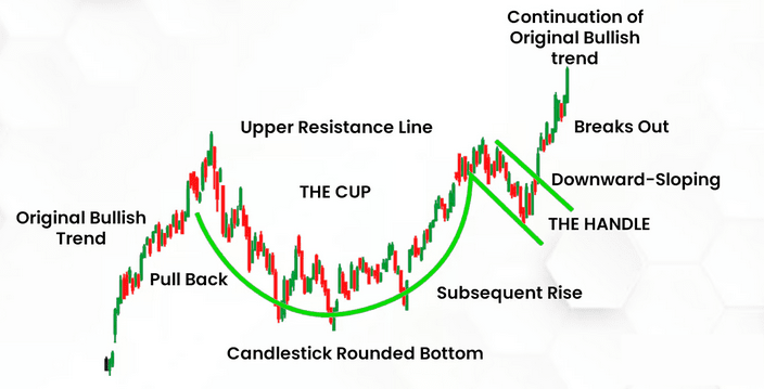 La configuration en forme de tasse et de poignée est un indicateur d'analyse technique qui signale une poursuite haussière. Ce motif se compose de deux parties : une « tasse », qui ressemble à un fond arrondi, et une « poignée », qui forme une légère dérive vers le bas avant une cassure vers le haut. La formation de cette tendance précède généralement des mouvements de prix à la hausse importants, car elle représente une période de consolidation suivie d’un regain d’intérêt pour les acheteurs.