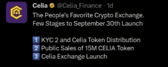 Celia est un prochain Ă©change de crypto-monnaie qui devrait ĂȘtre lancĂ© d'ici le 30 septembre 2024.