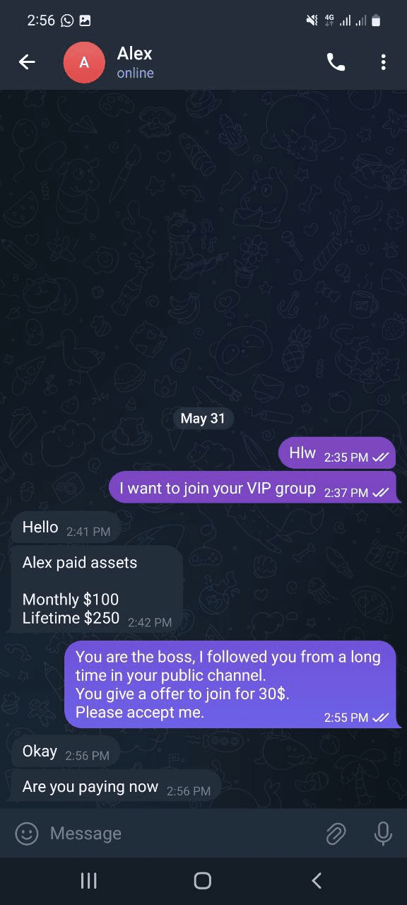 Cet article s'adresse aux débutants qui recherchent des signaux destinés au meilleur trader/arnaqueur. J'ai un rapport sur certains groupes/chaînes/administrateurs de grandes pages, etc. Ils vous montrent beaucoup de bénéfices dans leur groupe VIP, mais c'est presque tous des faux. S'ils ont raison, pourquoi mendient-ils de l'argent pour vous donner un signal ? S'ils ne prennent pas de frais, pourquoi vous donnent-ils un signal gratuit ?