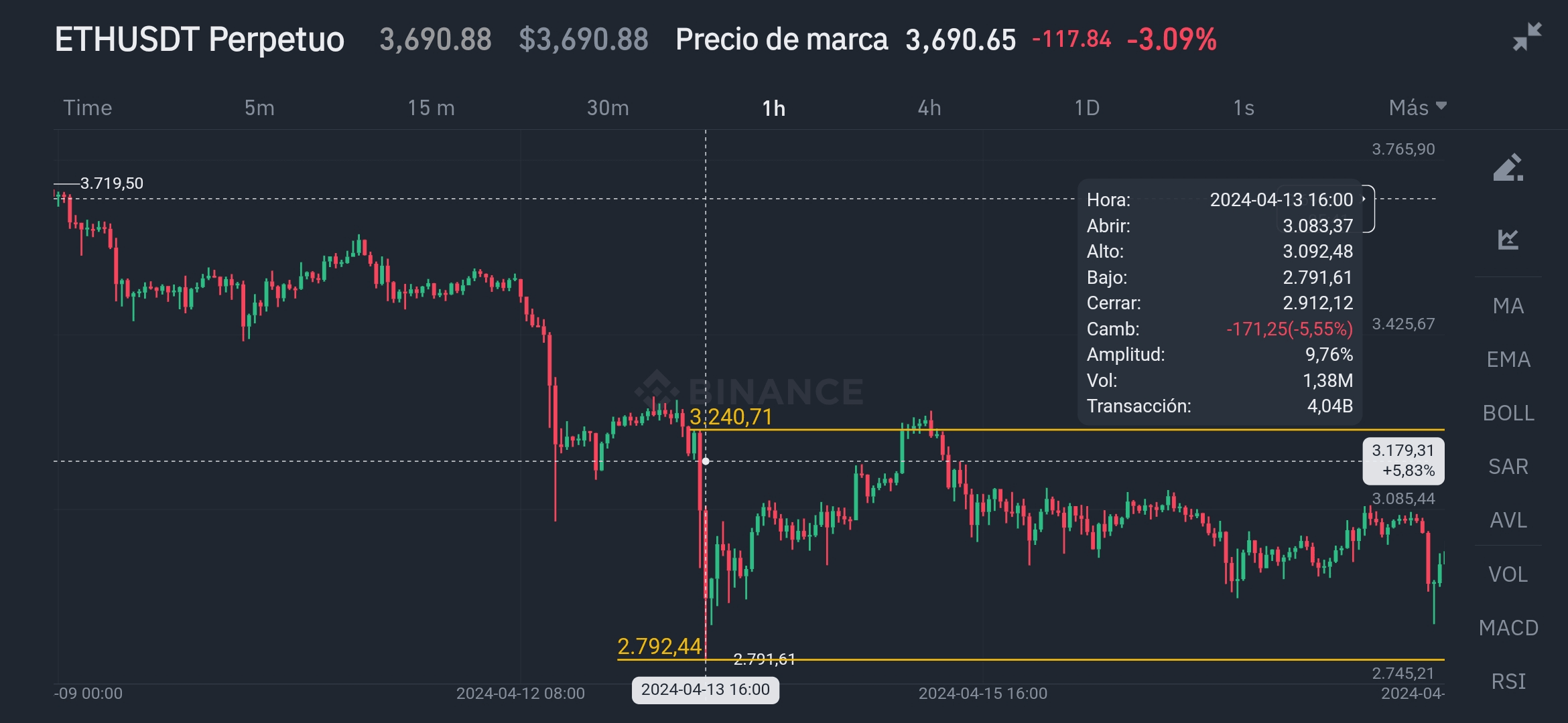 Par conséquent, l'ETH le 14 mars à 16h00 avec 2 bougies baissières exactement comme celles du BTC, se positionne à 3 240$ pour tomber à 2 792$.