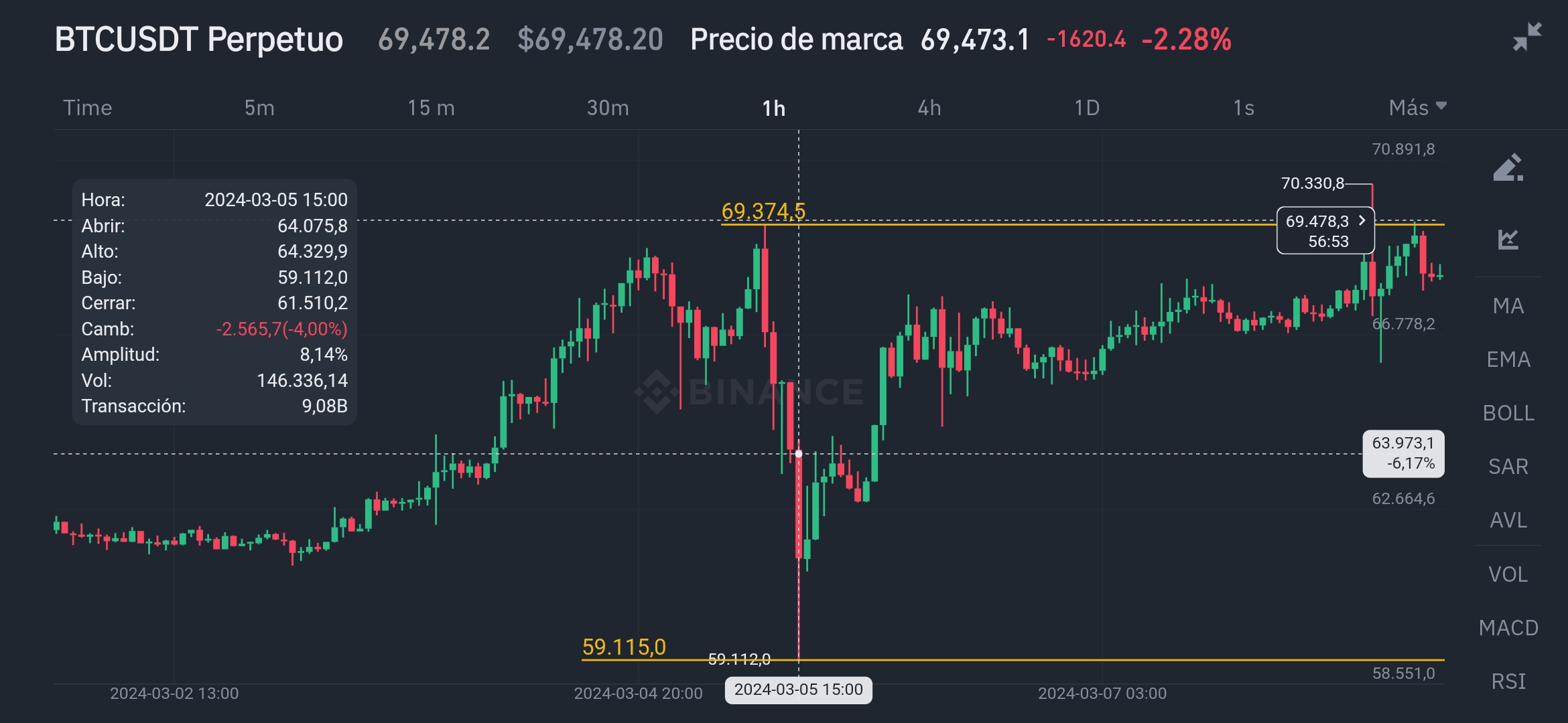 BTC, le 5 mars, entame une tendance à la baisse après avoir apparemment atteint un double sommet en touchant 69 000 $, passe 5 heures à chuter jusqu'à atteindre 59 000 $ dans une décharge rapide, procède à une récupération dans les heures suivantes et reprend le prix des heures précédentes. à la décharge, en plus de démarrer la tendance à la hausse qui l'amène à toucher à nouveau 70 000 $, puis à avoir à nouveau un mouvement de baisse rapide mais il récupère rapidement, cela peut être vu à la fin de l'image.
