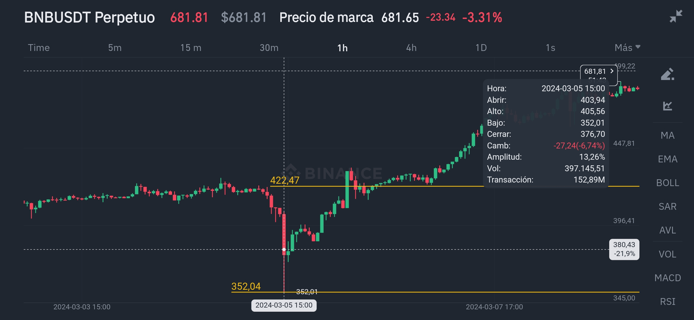 Pour comparer une autre crypto, nous avons le BNB, le 5 mars il entame une tendance à la baisse avec de petites bougies jusqu'à arriver à 15h00 la pression à la baisse l'amène à toucher 352$ après avoir été à 422$. Il se remet du dumping, continue à augmenter et récupère le prix précédent pour amorcer une tendance à la hausse et parvient également à dépasser le prix qu'il avait eu des heures après le dump.