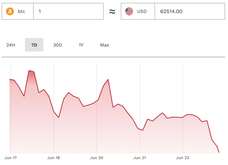Le prix du bitcoin est tombé à 58 402 dollars, son plus bas niveau depuis début mai et en baisse de plus de 10 % par rapport à son récent sommet. Pendant ce temps, les prix des 10 autres principales pièces Ethereum, XRP et Solana ont chuté encore plus fortement, effaçant plus de 250 milliards de dollars du marché global au cours de la semaine dernière.