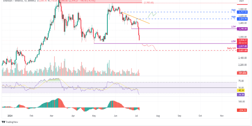 Harga Ethereum (ETH) ditolak oleh garis tren menurun pada hari Senin, menyebabkan penurunan 11% selama tiga hari berikutnya. Pada penutupan hari Kamis, harga Ethereum ETH telah turun di bawah harga terendah 24 Juni di $3,240 dan saat ini kembali ke harga terendah 1 Mei di $2,817. Pada hari Jumat, harga Ethereum diperdagangkan sekitar $2,914, turun 4,4% lebih lanjut dari level hari sebelumnya.