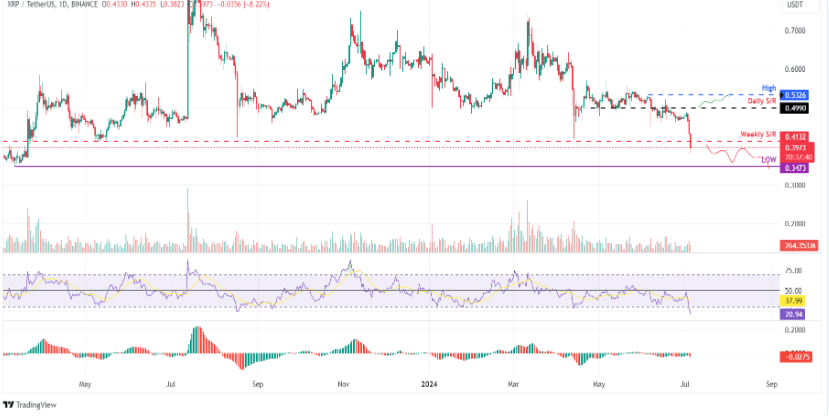 Harga Ripple menemui resistensi di level harian $0,499 pada hari Selasa, menyebabkan penurunan 11% selama dua hari berikutnya. Pada saat penulisan, harga diperdagangkan 8,7% lebih rendah pada $0,393, di bawah support mingguan di $0,413.