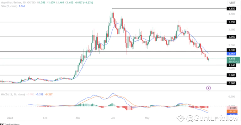 Dogwifhat (WIF) telah mengalami penurunan signifikan sebesar 5.60% dalam sehari terakhir dan sekitar 30% dalam tujuh hari terakhir, mencerminkan sentimen bearish yang mendominasi pasar, seperti informasi yang kami kutip dari coinpedia.org. Indikator Simple Moving Average (SMA) menunjukkan adanya resistensi yang kuat, namun potensi bullish reversal tetap ada.