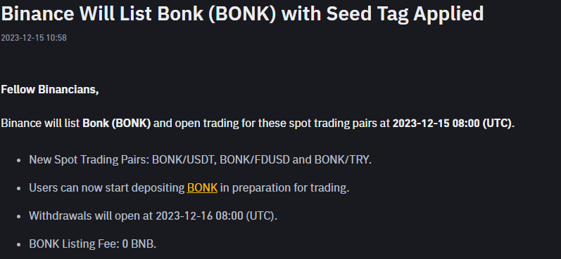 Salah satu faktor yang mungkin memicu kenaikan terbaru ini adalah inklusi BONK dalam perdagangan spot di Binance. Pada 15 Desember, Binance mengumumkan pembukaan perdagangan BONK dengan pasangan spot perdagangan, yaitu BONK/USDT, BONK/FDUSD, dan BONK/TRY.