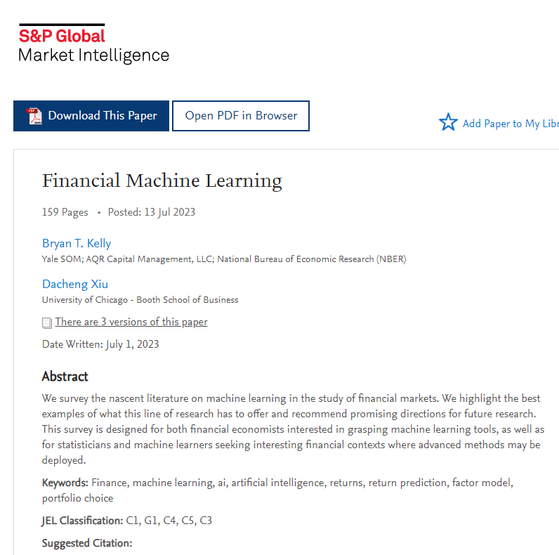 Dalam artikel mereka yang berjudul “Financial Machine Learning,” Bryan T. Kelly dan Dacheng Xiu mengeksplorasi penerapan teknik pembelajaran mesin dalam studi pasar keuangan. Diterbitkan pada bulan Juli 2023, artikel ini memberikan ikhtisar literatur yang muncul mengenai topik tersebut, menyoroti contoh-contoh yang paling menjanjikan dan mengusulkan arah penelitian di masa depan. Ditujukan bagi para ekonom keuangan yang ingin memahami alat pembelajaran mesin dan bagi ahli statistik dan spesialis pembelajaran mesin yang mencari konteks keuangan menarik untuk menerapkan metode tingkat lanjut, artikel ini memposisikan dirinya sebagai referensi penting di lapangan. Para penulis mengutip sejumlah karya sebelumnya untuk mendukung analisis dan rekomendasi mereka, sehingga membantu memperkaya perdebatan akademis dan praktis mengenai integrasi kecerdasan buatan dalam keuangan.