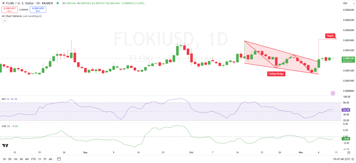 Jika harga FLOKI berhasil menembus resistensi ini setelah pola falling wedge, target harganya sekitar $0.00001800. Kenaikan lebih lanjut dapat mendorong harga setinggi $0.00003500, menunjukkan peningkatan potensial sebesar 142% dari level breakout.