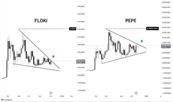 FLOKI dan PEPE memecoin menunjukkan pola bullish pennant dengan target breakout di $0.00001800 dan $0.000017547, masing-masing.