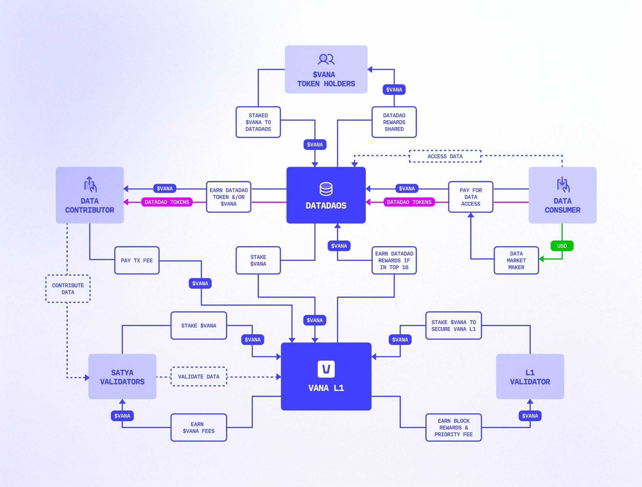 Vana merupakan blockchain lapisan-1 yang kompatibel dengan EVM, dirancang untuk mengembalikan kendali data pribadi ke tangan individu dan memungkinkan AI milik pengguna melalui transaksi data yang aman dan terjaga privasinya. Dengan memadukan koordinasi blockchain, teknologi privasi, dan insentif ekonomi berbasis token, Vana menciptakan ekosistem dinamis yang dapat memberdayakan individu untuk memiliki, membagikan, dan memonetisasi data mereka secara adil.