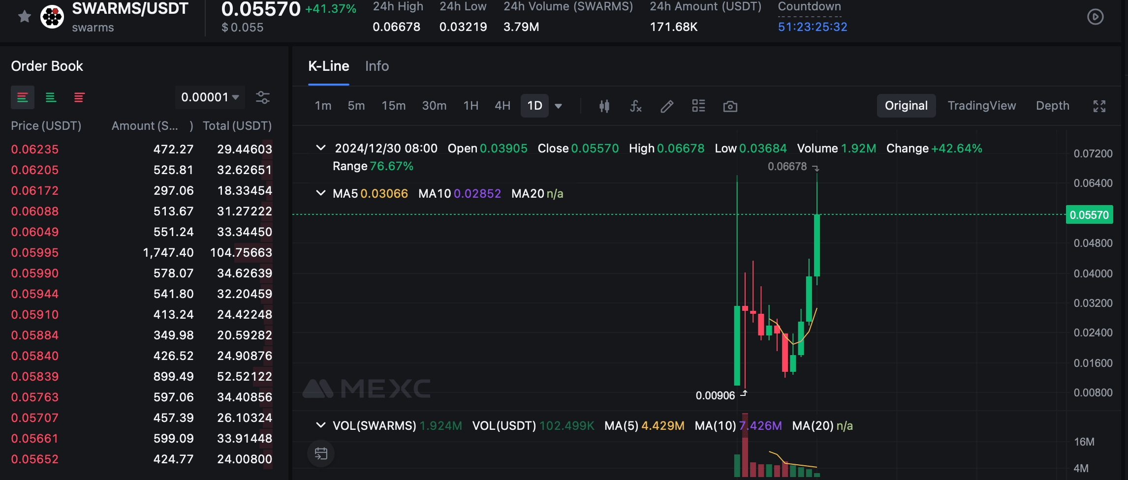 Jika Anda tertarik dengan token yang bergerak cepat, $SWARMS telah mencuri perhatian. Sejak awal pencatatannya di MEXC, harganya meroket hingga 637%, mendorong kapitalisasi pasarnya melewati $60 juta dengan harga sekarang di $0,05718. Lumayan untuk proyek yang baru saja dimulai, bukan?