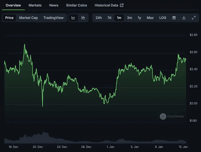 Sisi positifnya, resistensi berikutnya berada di $2.72, titik tertinggi gelombang B. Penembusan di atas level ini dapat menyebabkan pengujian ulang titik tertinggi bulan Desember di sekitar $2.90, dengan era tertinggi sepanjang masa di $3.40 kemungkinan akan tercapai jika momentum bullish baru terpicu.