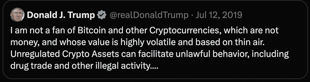 Empat tahun lalu, Trump mengkritik Bitcoin dan ruang kripto yang lebih luas. Sekarang, dia