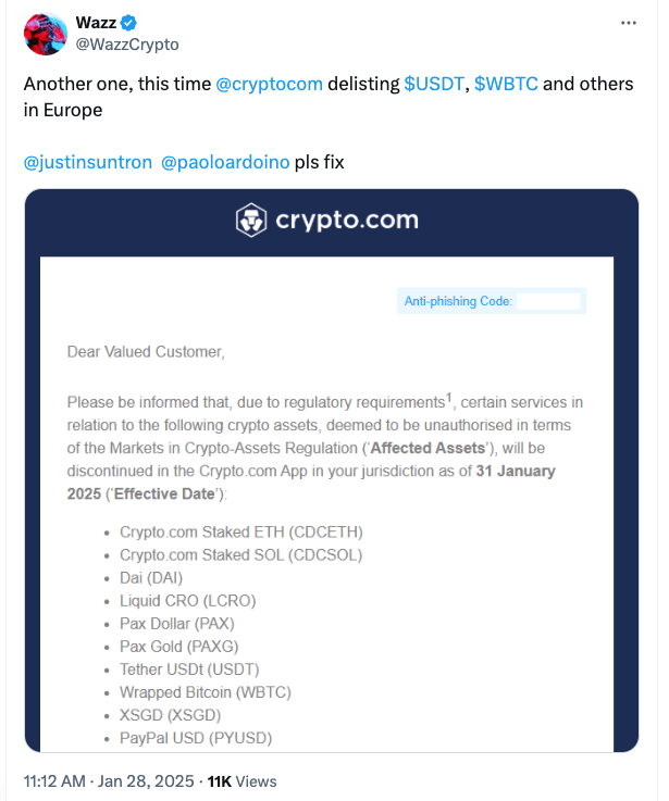 Penghapusan daftar terkait MiCA oleh Crypto.com akan mempengaruhi total 10 cryptocurrency, menurut laporan media sosial yang mengutip pemberitahuan email dari bursa pada 28 Januari.
