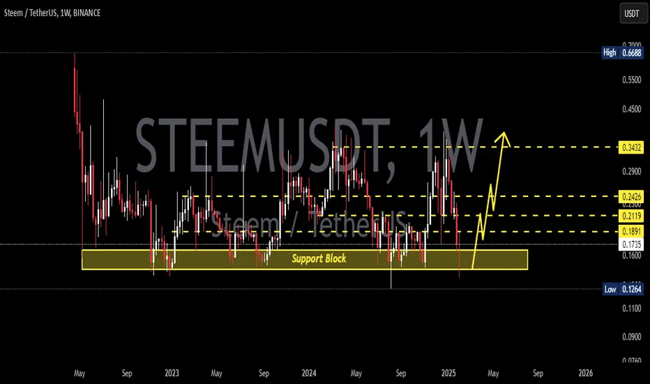 Melihat grafik mingguan, STEEM saat ini berada di blok dukungan kunci. Anggap ini sebagai fondasi yang kuat ๐งฑ โ ini adalah level di mana pembeli mungkin masuk, berharap untuk rebound harga.