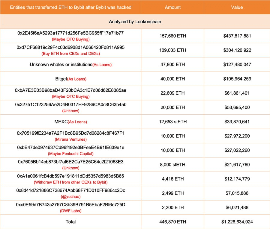 Bagaimana mereka melakukannya? 🤔 Menurut Lookonchain, Bybit menutupi defisit tersebut menggunakan dana pinjaman, simpanan paus, dan pembelian OTC ETH.