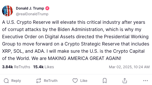 Dalam sebuah pos di Truth Social, Presiden Amerika Donald Trump pertama kali membagikan informasi tentang mata uang yang direncanakan akan dimasukkan ke dalam Cadangan Strategis mata uang kripto yang mencakup $BTC (Bitcoin), $ETH (Ethereum), $XRP (Ripple), SOL (Solana) dan ADA (Cardano). Sebelumnya informasi ini belum disebutkan.