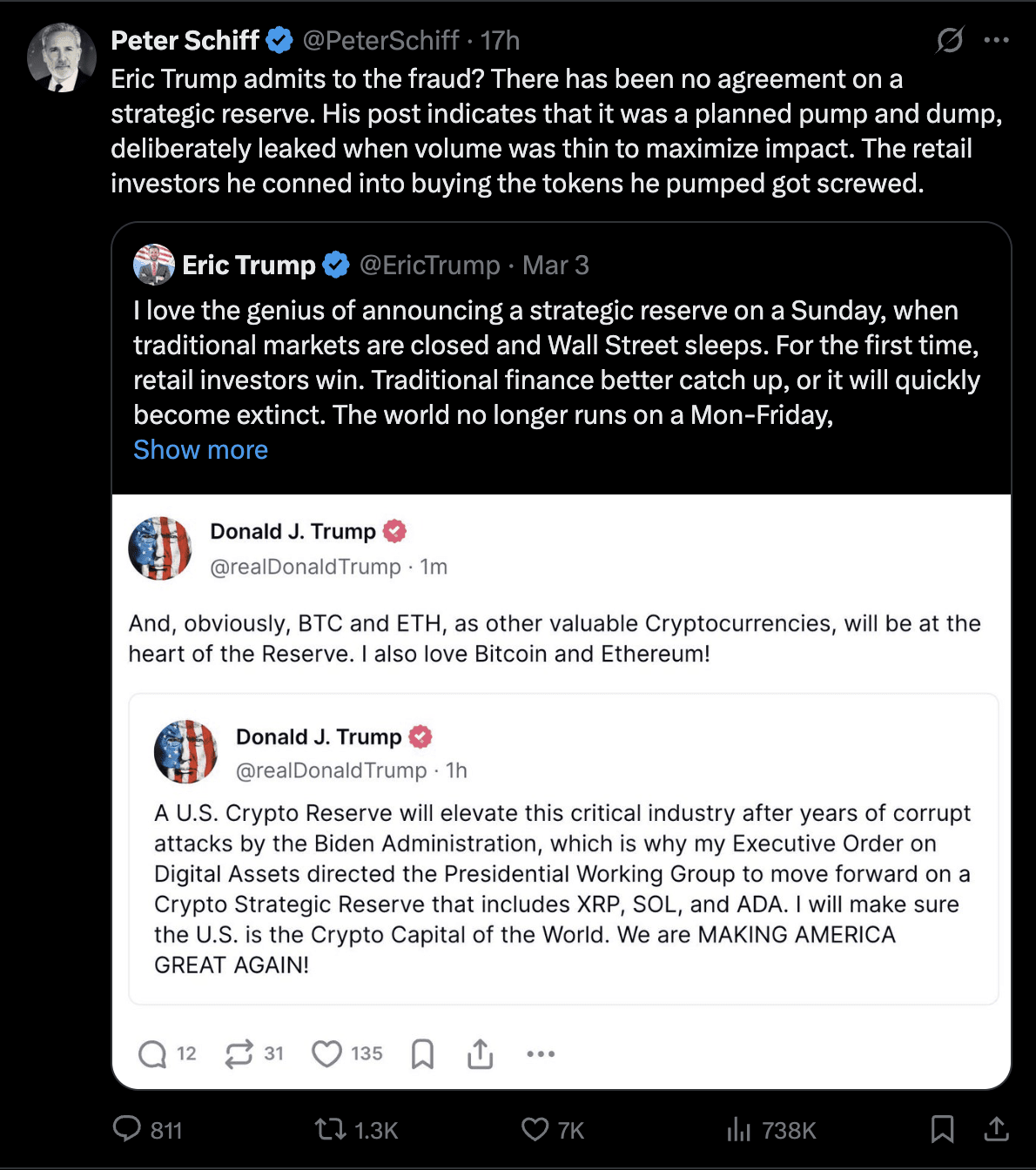 Ekonom terkenal dan skeptis crypto Peter Schiff, presiden Euro Pacific Capital, secara terbuka menuduh Eric Trump melakukan manipulasi pasar. Dia mengkritik tweet terbaru Eric di mana dia memuji ide "brilian" ayahnya tentang cadangan cryptocurrency.