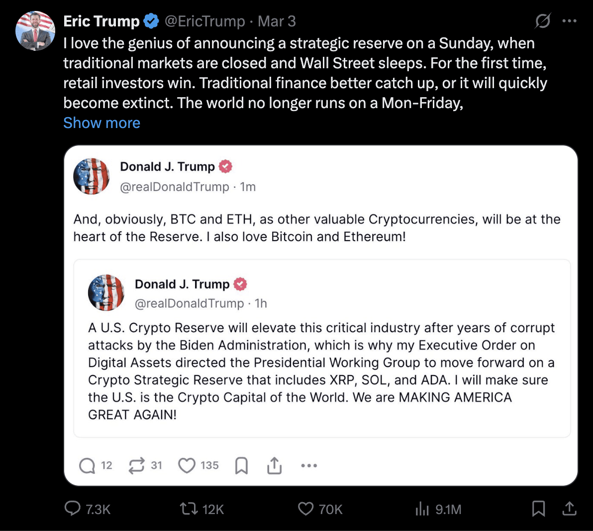 Eric Trump secara aktif membagikan rekomendasi perdagangan di platform X, mendesak para pengikutnya untuk berinvestasi dalam cryptocurrency. Misalnya, pada 25 Februari 2025, ia merekomendasikan untuk membeli aset digital. Lalu, pada 2 Februari, ayahnya, Donald Trump, secara tak terduga mengumumkan pembentukan cadangan cryptocurrency nasional, yang menyebabkan harga Bitcoin ($BTC ) melonjak sebesar $10,000 dan memicu minat pada cryptocurrency lain yang disebutkan dalam pos Eric.