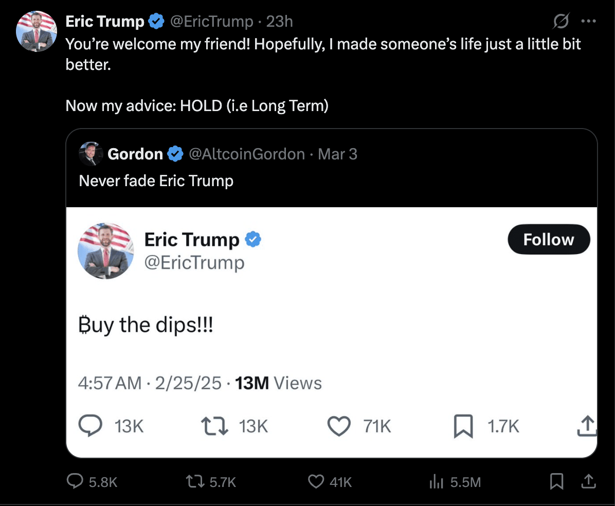 Setelah koreksi pasar pada 3 Maret 2025, Eric sekali lagi menghubungi para pengikutnya, mendesak mereka untuk mempertahankan aset crypto mereka dalam jangka panjang. Namun, segera setelah tweet-nya, Bitcoin mulai turun lagi, memicu kecurigaan bahwa semua ini adalah bagian dari skema yang telah direncanakan.
