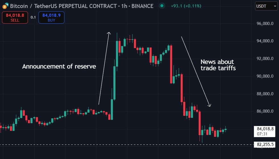 Menurut perintah ini, Kelompok Kerja Presiden akan bertanggung jawab untuk membentuk cadangan crypto, yang akan mencakup BTC, ETH, XRP, SOL, dan ADA. Namun pada 28 Februari, puncak crypto diumumkan, yang akan berlangsung pada 7 Maret 2025, dan pasar merespons dengan beberapa positif lokal. Ini diikuti dengan semacam minggu pemanasan untuk dorongan crypto.