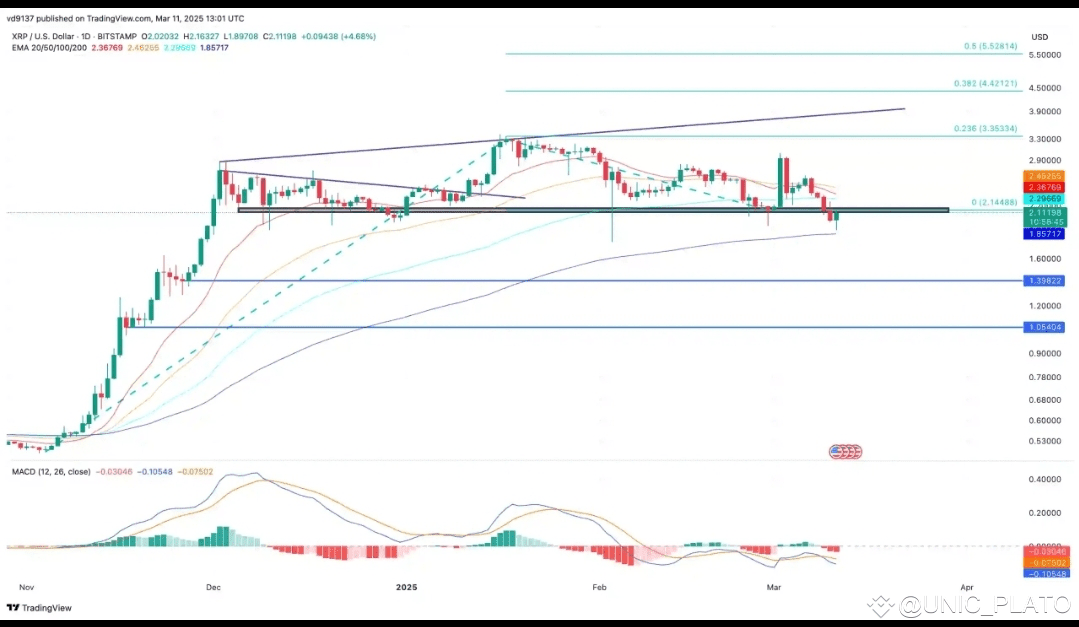 XRP has seen an intraday recovery of 4.52%, trading at $2.10. This reflects a retest of the previously broken supply zone and a potential reversal from the 200-day EMA. With the market in a volatile state, XRP is facing one of its most significant corrections. The question remains whether this recovery will lead to a price increase to $3.35 or if a drop to $1.40 is unavoidable.