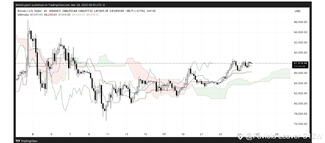 Grafik Ichimoku Cloud Bitcoin menunjukkan struktur bullish yang solid, di mana harga bertahan di atas cloud serta awan hijau yang bergerak naik ke depan.