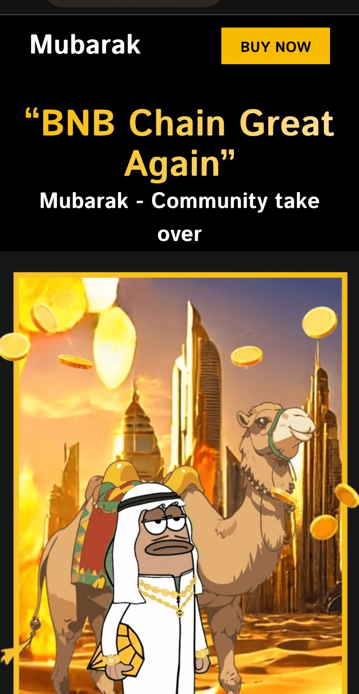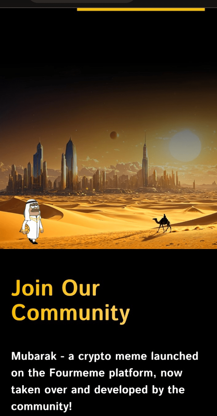 MUBARAK debut pada 14 Maret 2025, melalui platform Four.Meme di BSC, memanfaatkan infrastruktur Binance dan investasi $2 miliar dari Abu Dhabi ke bursa. Namanya, yang berarti “diberkati” dalam bahasa Arab, mencerminkan pengakuan strategis terhadap budaya Timur Tengah dan upaya ekspansi regional Binance. $MUBARAK