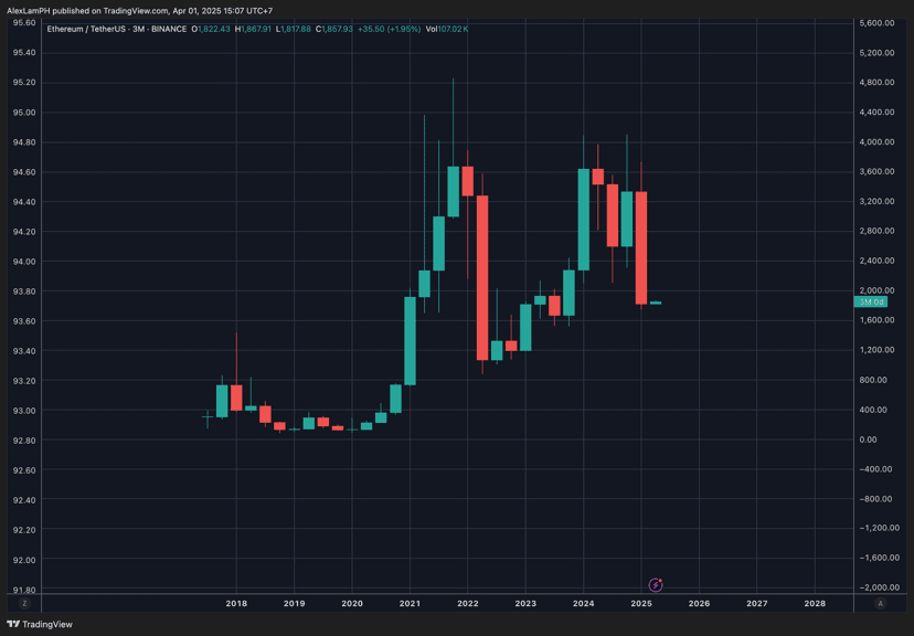 Tetapi ketika Anda melihat grafik kuartalan, lilin Q1/2025 sangat mirip dengan Q2/2021 — yang mendahului rally besar. Saya cenderung pada kemungkinan bahwa Ethereum bisa bersiap untuk rebound di kuartal-kuartal mendatang.