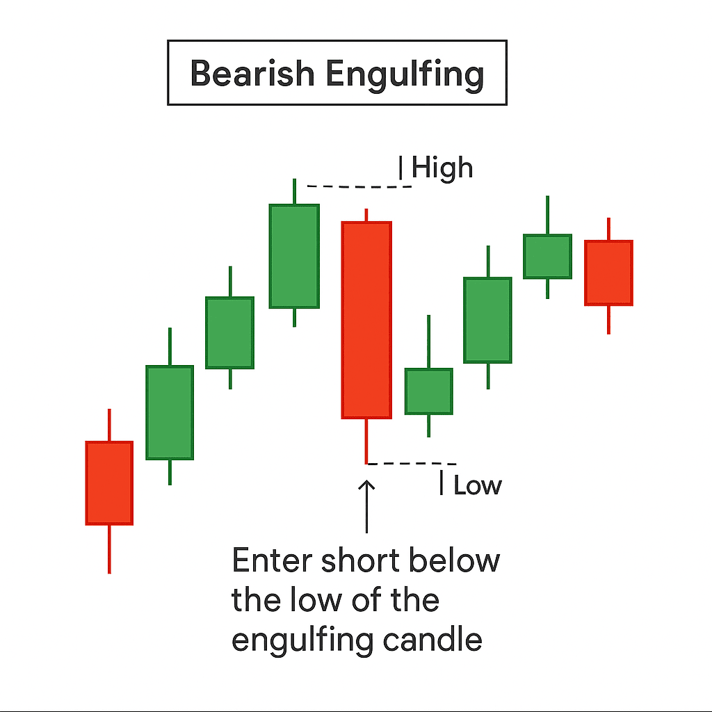 Anda menunggu harga turun sedikit di bawah titik terendah ("low") dari candle engulfing bearish, dan kemudian Anda membuka posisi short ketika itu terjadi. Ini mengkonfirmasi momentum bearish sebelum berkomitmen pada perdagangan.