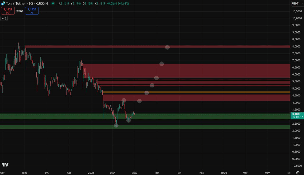 Kompresi harga di $TON pasar dekat dukungan harus diikuti oleh persyaratan teknis untuk merebut kembali area resistensi di atas. Kenaikan harga yang berkelanjutan memerlukan penembusan yang kuat melalui area resistensi ini. Melanggar zona oranye yang ditandai akan memulai percepatan dalam momentum karena peserta pasar akan memulai perubahan strategi.