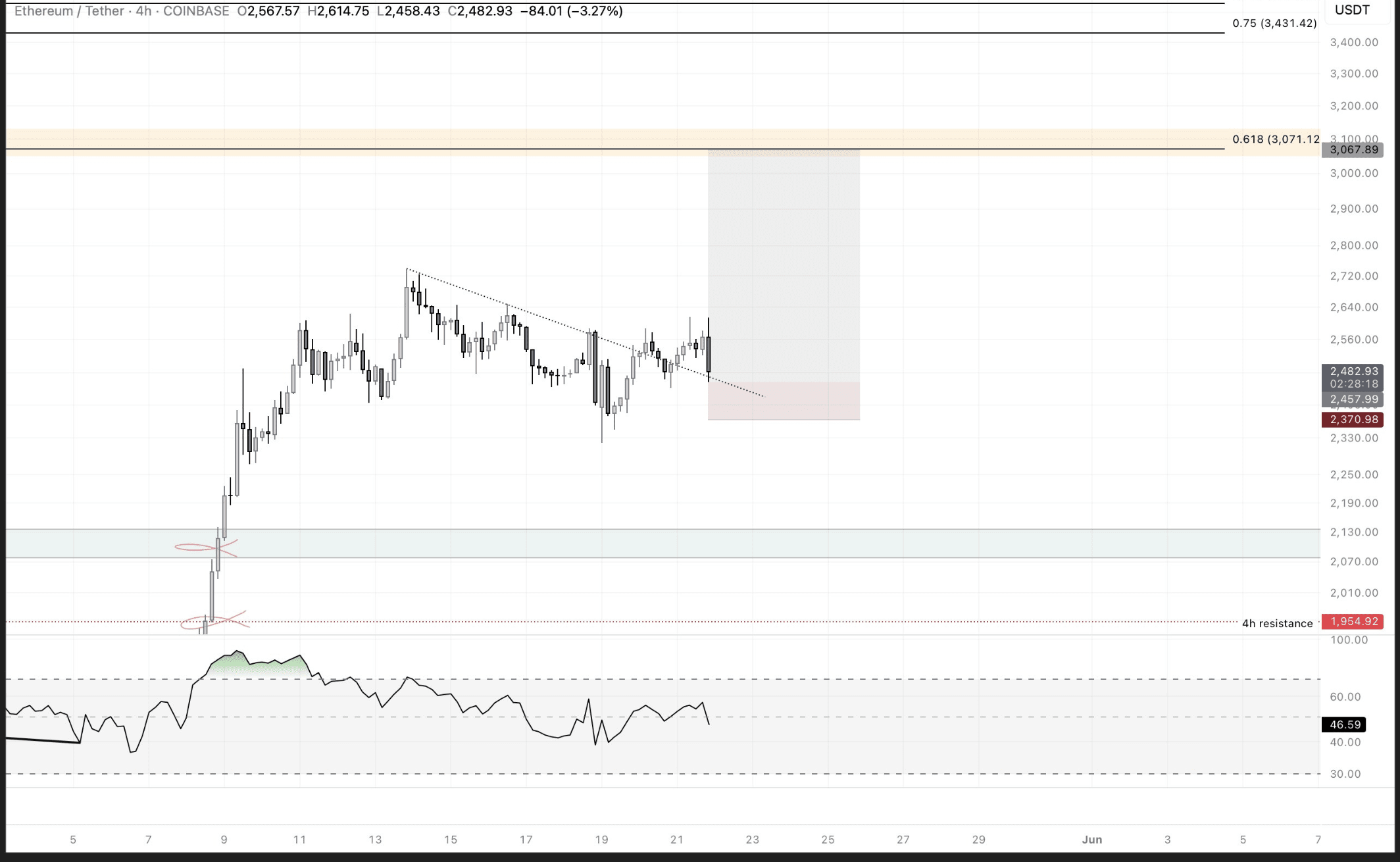 Harga saat ini sekitar $2,482, sedikit mundur setelah menguji di atas level breakout.
